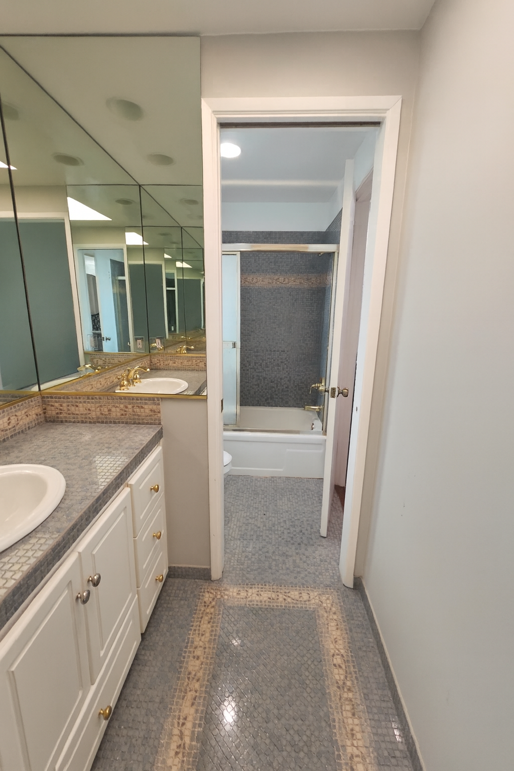 Before: The original bathroom had dated mosaic flooring, mirrored walls, and gold fixtures that gave the space a heavy, outdated feel.