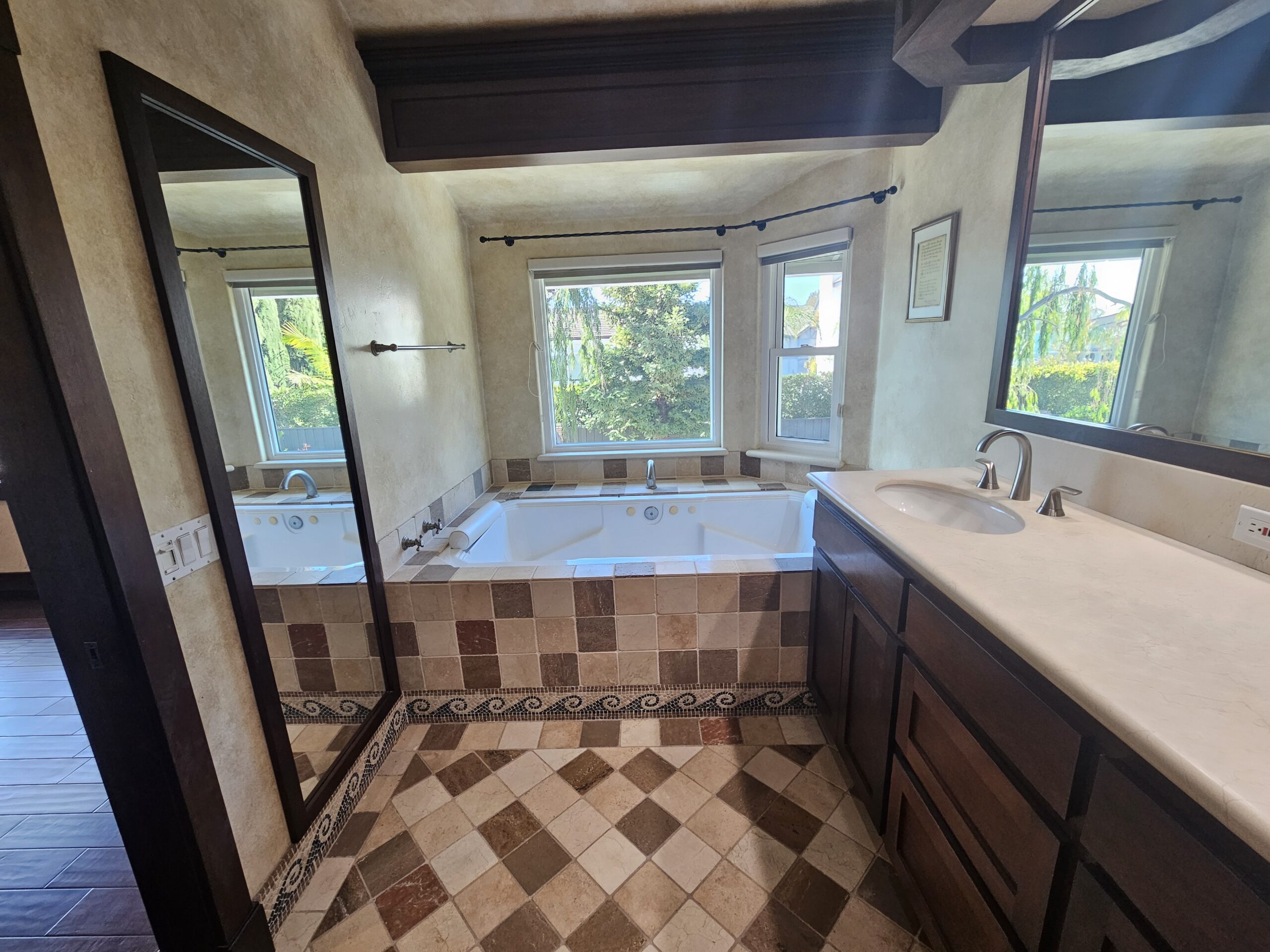 The new double-sink vanity in natural wood adds warmth and functionality to the space. Topped with a crisp quartz countertop, paired with bronze fixtures, and accented by rustic framed mirrors, the vanity offers both style and storage, becoming a standout feature of the remodel. Its clean lines and organic tones strike the perfect balance between modern elegance and everyday practicality.