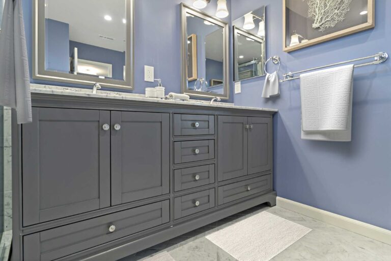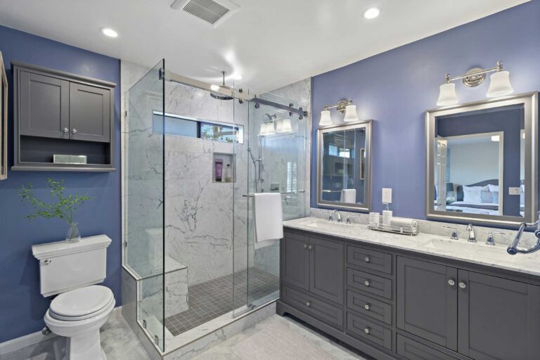 Once dated and enclosed, this Mission Viejo bathroom is now anchored by a stunning walk-in shower featuring flawless marble-look tile and a sleek frameless glass enclosure. The addition of a spacious double sink vanity with ample storage, paired with elegant lighting and deep blue accent walls, creates a refined and inviting retreat.