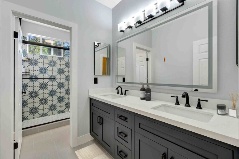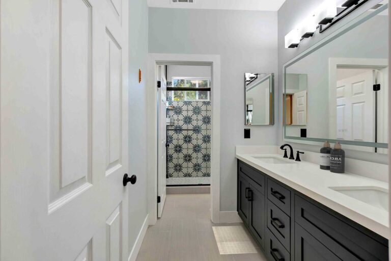 A stylish update in this San Clemente bathroom showcases a sleek double vanity with rich cabinetry, pristine white countertops, and modern black hardware. The look is completed with new lighting and a clean palette that complements the patterned tile details in the shower.
