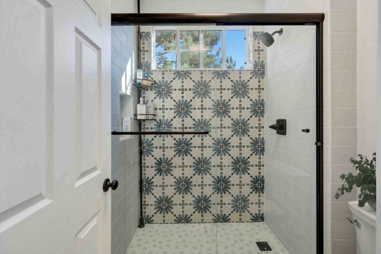 The old tub-shower combo in San Clemente was replaced with a walk-in shower featuring striking patterned accent tiles framed by clean white subway tile. Matte black fixtures and a glass enclosure complete the modern, eye-catching design.