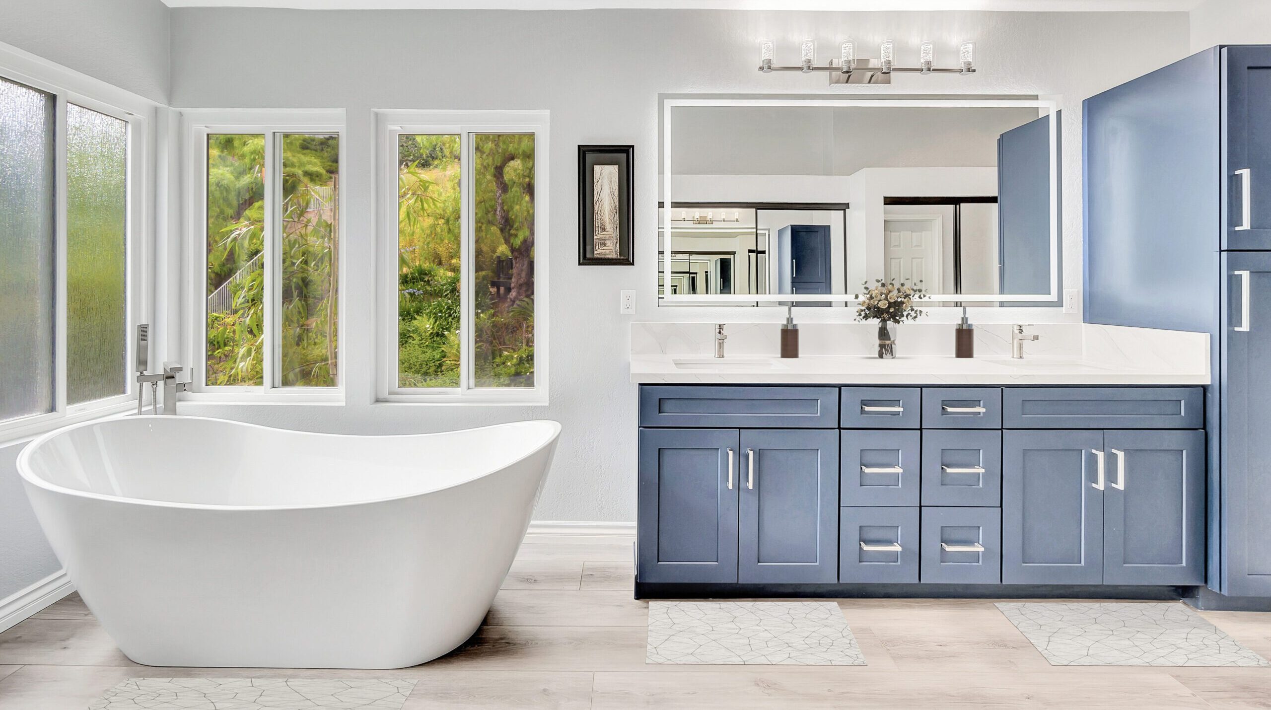 This Laguna Hills master bath remodel with freestanding tub showcases the growing trend in Orange County: combining a sleek freestanding soaking tub with a spacious double vanity. The blue shaker-style cabinetry and floor-to-ceiling windows create an open, light-filled space while the drawer-based storage and quality finishes deliver both function and luxury.