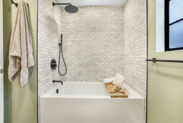 The bathing area features a clean and elegant tub-shower combo, wrapped in honed marble subway tile that adds texture and subtle luxury without overwhelming the space. A high-pressure rainfall shower system paired with a sleek matte black tub filler creates a spa-inspired experience while maintaining everyday functionality. The acrylic alcove tub completes the look, offering both beauty and comfort.